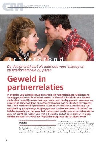 In situaties van huiselijk geweld wordt in de hulpverleningspraktijk nog te weinig gewerkt met de partners samen. In dit artikel belicht ik een nieuwe methodiek, waarbij we met het paar samen aan de slag gaan en waarmee we onderlinge samenwerking en zelfwerkzaamheid van de cliënten bevorderen. Het is een methode die polarisatie in het paar vermijdt en een dialoog over veiligheid op gang brengt. Uitgangspunten zijn het aansluiten bij de leef- en betekeniswereld van het paar, het zoeken naar krachtbronnen en uitzonderingen, het zichtbaar maken van wat al bereikt is en het door cliënten in eigen handen nemen van zowel het hulpverleningsproces als het eigen leven.
