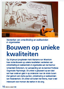 Op 24 januari jongstleden hield Marianne van Woerkom haar oratie Bouwen op unieke kwaliteiten: versterken van ontwikkeling en welbevinden in organisaties aan de Erasmus Universiteit Rotterdam, ter aanvaarding van de leerstoel Positieve Organisatie Psychologie. Dit artikel is gebaseerd op een deel van haar oratie en gaat in op onderzoek naar de relatie tussen (het gebruik van) sterke punten, ontwikkeling en welbevinden van medewerkers. Dit artikel valt buiten het thema, maar is wel interessant voor mensen die werken in de zorg.