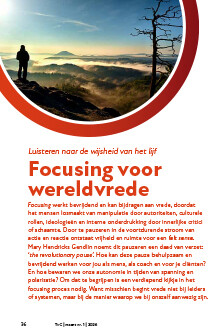 Focusing werkt bevrijdend en kan bijdragen aan vrede, doordat het mensen losmaakt van manipulatie door autoriteiten, culturele rollen, ideologieën en interne onderdrukking door innerlijke critici of schaamte. Door te pauzeren in de voortdurende stroom van actie en reactie ontstaat vrijheid en ruimte voor een felt sense. Mary Hendricks Gendlin noemt dit pauzeren een daad van verzet: ‘the revolutionary pause’. Hoe kan deze pauze behulpzaam en bevrijdend werken voor jou als mens, als coach en voor je cliënten? En hoe bewaren we onze autonomie in tijden van spanning en polarisatie? Om dat te begrijpen is een verdiepend kijkje in het focusing proces nodig. Want misschien begint vrede niet bij leiders of systemen, maar bij de manier waarop we bij onszelf aanwezig zijn.