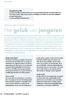De Nederlandse jeugd staat te boek als de gelukkigste ter wereld. Niet gelukkig in de zin van hedonistisch of egoïstisch welbevinden, maar in de zin van het leiden van een plezierig, betrokken en betekenisvol leven. Gelukkig zijn vormt een beschermende factor in de tienerjaren, het beschermt tegen depressie, risicogedrag en schooluitval. Vaardigheden die helpen om je gelukkig te voelen, zijn sociaal en emotioneel van aard en worden ook op school ontwikkeld, meestal tussen de bedrijven door. Een goede leefbaarheid van de omgeving, met voldoende veiligheid, vrijheid en rechtvaardigheid, vergroot de kans om gelukkig te zijn. Dat geldt ook voor de leefbaarheid van de schoolomgeving.