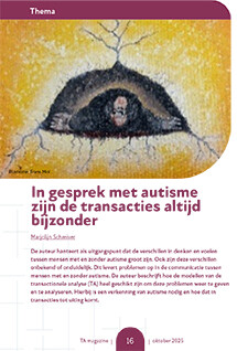 De auteur hanteert als uitgangspunt dat de verschillen in denken en voelen tussen mensen met en zonder autisme groot zijn. Ook zijn deze verschillen onbekend of onduidelijk. Dit levert problemen op in de communicatie tussen mensen met en zonder autisme. De auteur beschrijft hoe de modellen van de transactionele analyse (TA) heel geschikt zijn om deze problemen weer te geven en te analyseren. Hierbij is een verkenning van autisme nodig en hoe dat in transacties tot uiting komt.