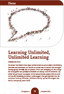 De auteur had tijdens haar eigen professionele en persoonlijke ontwikkeling behoefte aan handvaten om kennis en kunde mee te nemen naar de eigen beroepsgroep namelijk die van piloten. Het is een uitdaging om de concepten te koppelen aan praktijkvoorbeelden en daarop voort te borduren. Zij wilde het gat tussen concepten uit de transactionele analyse (TA) en werk en hoe die vertaalslag te maken, overbruggen. Dat gaf inspiratie voor de workshop ‘Learning Unlimited, Unlimited Learning’ op het TA-congres ‘wie ben ik, wie zijn wij, anno 2022’.