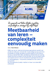 ASML is een van de meest kennisintensieve organisaties ter wereld. In een periode van snelle groei, met duizenden nieuwe collega’s per jaar, werd ‘time to competence’ cruciaal. Hoe bewijs je dan dat investeren in leren loont en hoe stuur je daarop? Robin Dijke, wereldwijd verantwoordelijk voor Learning Quality, Processen en Analytics, vertelt hoe ASML van een versnipperd beeld over kwaliteit van leren naar een bedrijfsbrede en geïntegreerde evaluatie - en meetstrategie ging - met scenario’s, standaarden en een cultuur van transparantie. Een intens gesprek vol praktijk, metaforen en lessen voor iedere L&D-professional.