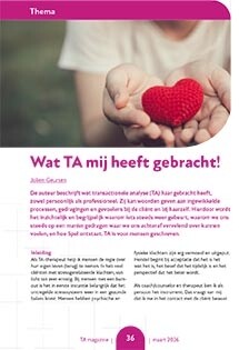 De auteur beschrijft wat transactionele analyse (TA) haar gebracht heeft, zowel persoonlijk als professioneel. Zij kan woorden geven aan ingewikkelde processen, gedragingen en gevoelens bij de cliënt en bij haarzelf. Hierdoor wordt het inzichtelijk en begrijpelijk waarom iets steeds weer gebeurt, waarom we ons steeds op een manier gedragen waar we ons achteraf vervelend over kunnen voelen, en hoe Spel ontstaat. TA is voor mensen geschreven.
